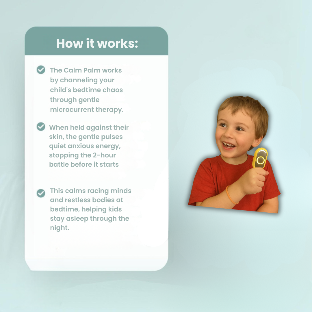 The Calm Palm uses gentle microcurrent pulses on key acupressure points to naturally calm your child's "worry brain" and racing thoughts. This palm-sized device puts the power of self-soothing directly in your child's hands - transforming 2-hour bedtime struggles into peaceful 30-minute wind-downs.