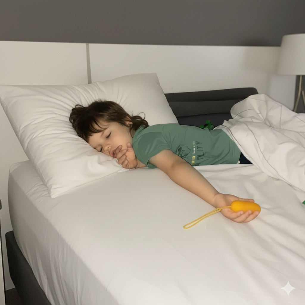 "Wife showed me this thing, i thought great another instagram scam targeting desperate parents... but after 6 months of our 5yo son taking 3+ hours to fall asleep every single night we were literally at divorce level fights from exhaustion so what the hell right. Thing actually works - not gonna lie it took him a few days to get used to the feeling (he said it tickles) but now he asks for his 'sleepy zapper' at bedtime. biggest change? he's not scared anymore, used to spiral about robbers/monsters/whatever and now he holds this thing and just... chills. stopped the midnight wake ups too which is HUGE, went from 3-4x a night to maybe once a week. only complaint is wished they had a better manual but figured it out, basically just turn it on and let them hold it while they fall asleep, don't overthink it"